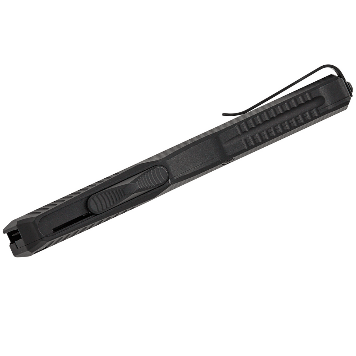 O cabo leve e resistente de alumínio anodizado preto é texturizado para uma pegada segura. O deep-carry pocket clip é facilmente reversível para transporte à esquerda/direita.