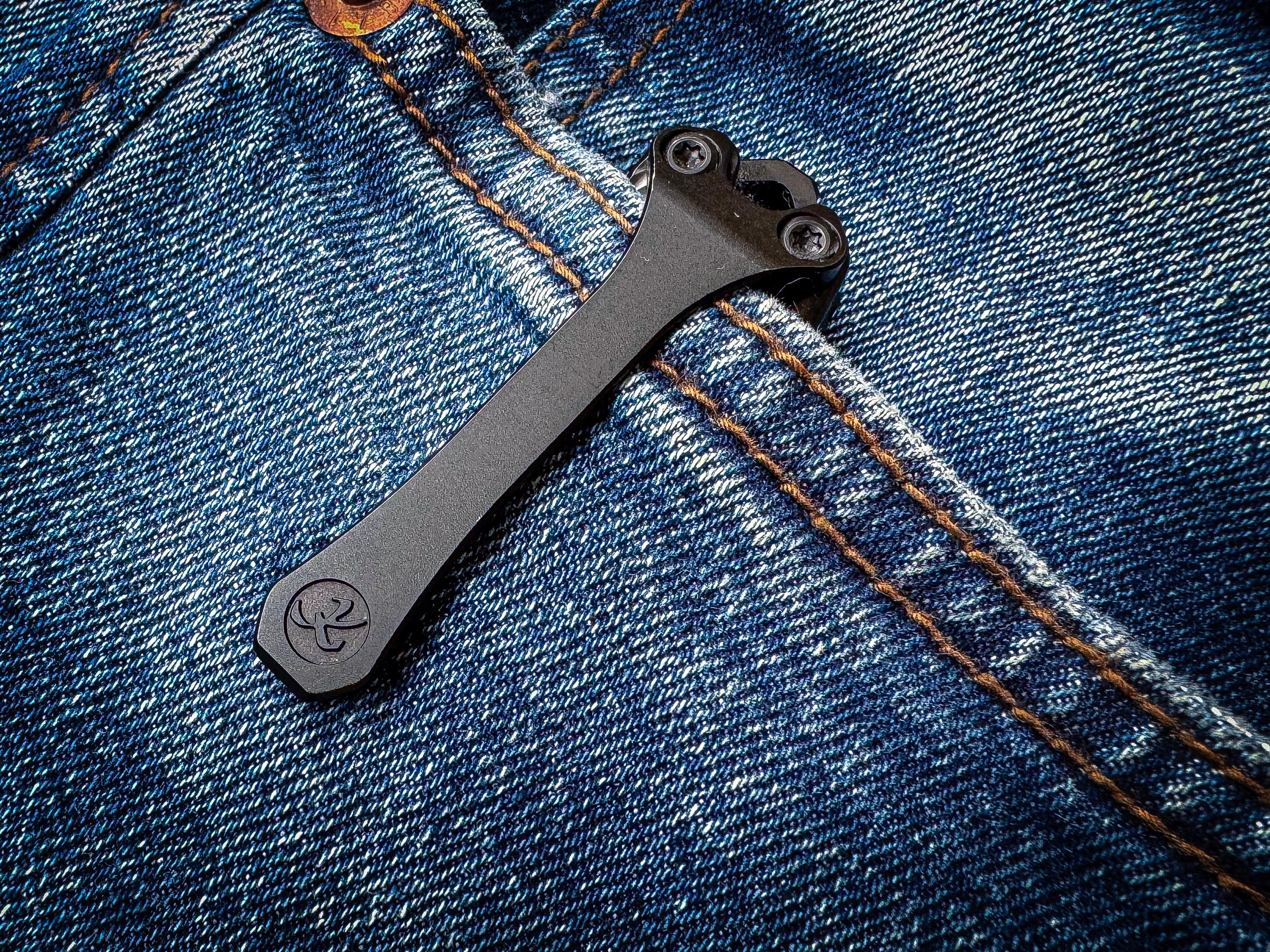 Outro destaque desta faca é o clip e backspacer de titânio, claro, pretos! O clip de titânio robusto garante que a faca possa ser transportada com segurança e discrição no bolso, mantendo a estabilidade e o conforto ao carregar. O backspacer adiciona resistência adicional ao cabo, melhorando a durabilidade geral da faca e a estabilidade da construção.