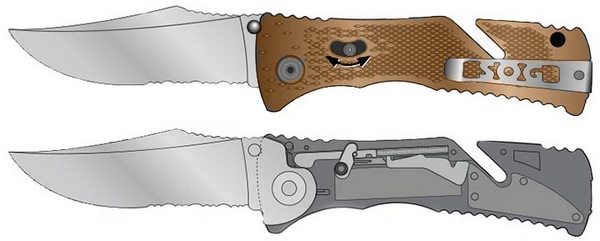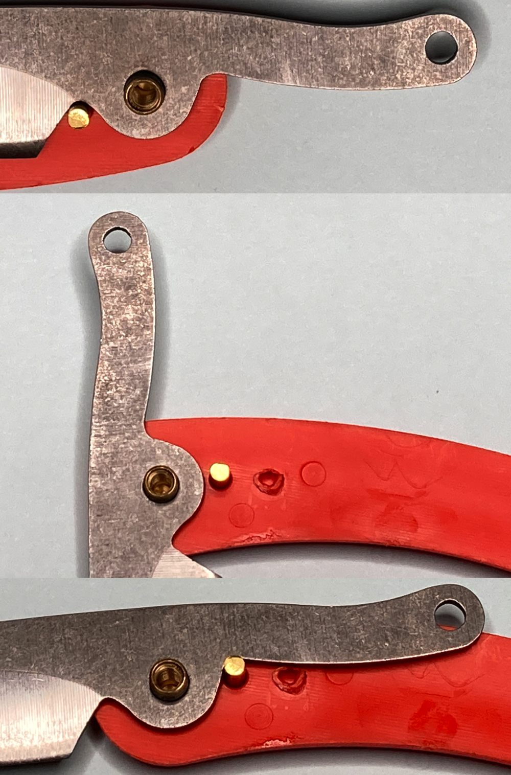 Desvantagens: Montagem possivelmente mais complicada após desmontagem da faca, necessidade de cuidado ao fechar com uma mão, possibilidade de leve folga na direção vertical – consequência do design do mecanismo