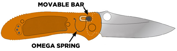 Totalmente ambidestro, o AXIS Lock é operacionalmente um dos sistemas mais intuitivos, mas descrever o mecanismo não é tão simples. As molas Omega tensionam a barra AXIS contra os entalhes na lâmina. Puxe a barra AXIS para trás para criar folga suficiente para que a lâmina gire para abrir ou fechar. As molas Omega garantem a tensão de bloqueio entre o pino de batente e a barra AXIS. O AXIS Lock geralmente tem um funcionamento muito suave, onde a lâmina cai livremente após ser liberada.