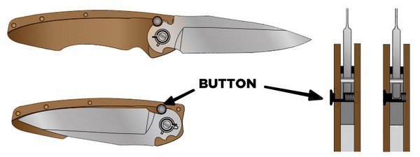 Pressionar o botão libera o bloqueio e assume a tensão da mola. Um sistema de pistão interno é responsável por bloquear na posição aberta e fechada. Em facas com bloqueio manual por botão, é necessário um mecanismo de abertura, como um flipper ou pino de polegar, para desdobrar.