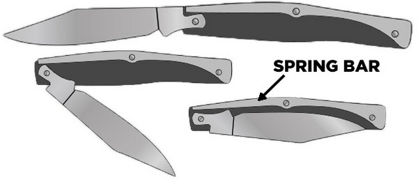 Facas com junta deslizante são facas sem travamento. As juntas deslizantes utilizam uma barra traseira tensionada para manter a lâmina na posição aberta ou fechada. Tenha cuidado ao cortar com uma junta deslizante. Qualquer tensão na espinha da lâmina pode potencialmente fechá-la diretamente sobre seus dedos, embora seja muito mais seguro usar um Slipjoint do que um Friction.
