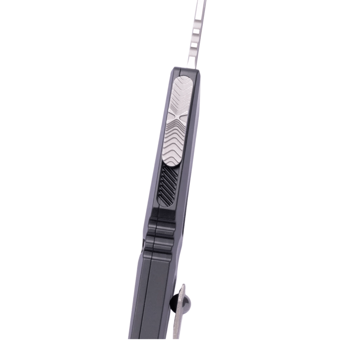 O cabo é fabricado com excelente precisão em tecnologia 3D em máquinas de fresagem CNC, a partir de alumínio preto 6061-T6 revestido com especificações militares. A textura da superfície do cabo e as entalhes profundos (jimping) tornam a faca antiderrapante durante o uso. O cabo é finalizado com um quebra-vidro, um triângulo de aço, no qual uma esfera de carboneto de tungstênio foi pressionada.