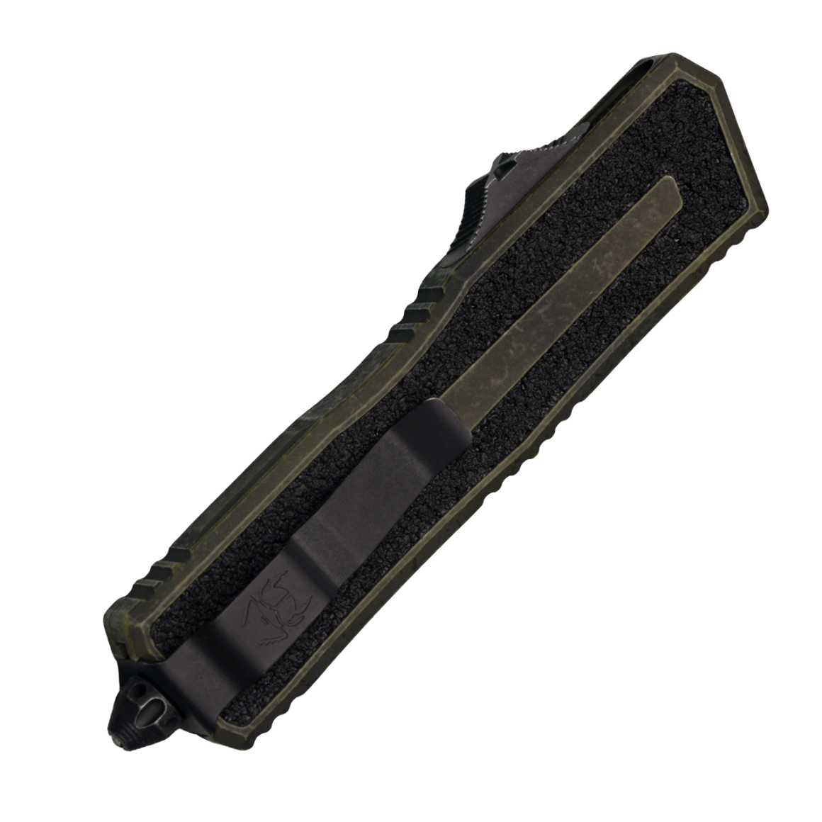 O perfil fino e o clip deep-carry sólido usinado em duas posições (direita/esquerda) permitem que a faca seja transportada discretamente no bolso, na posição tip-down. O clip apresenta o pictograma de escaravelho característico da linha. O cabo é finalizado com um quebra-vidro, um triângulo de aço sólido no qual uma esfera de carboneto de tungstênio foi pressionada. Também possui um orifício para entrelaçar uma linha decorativa.