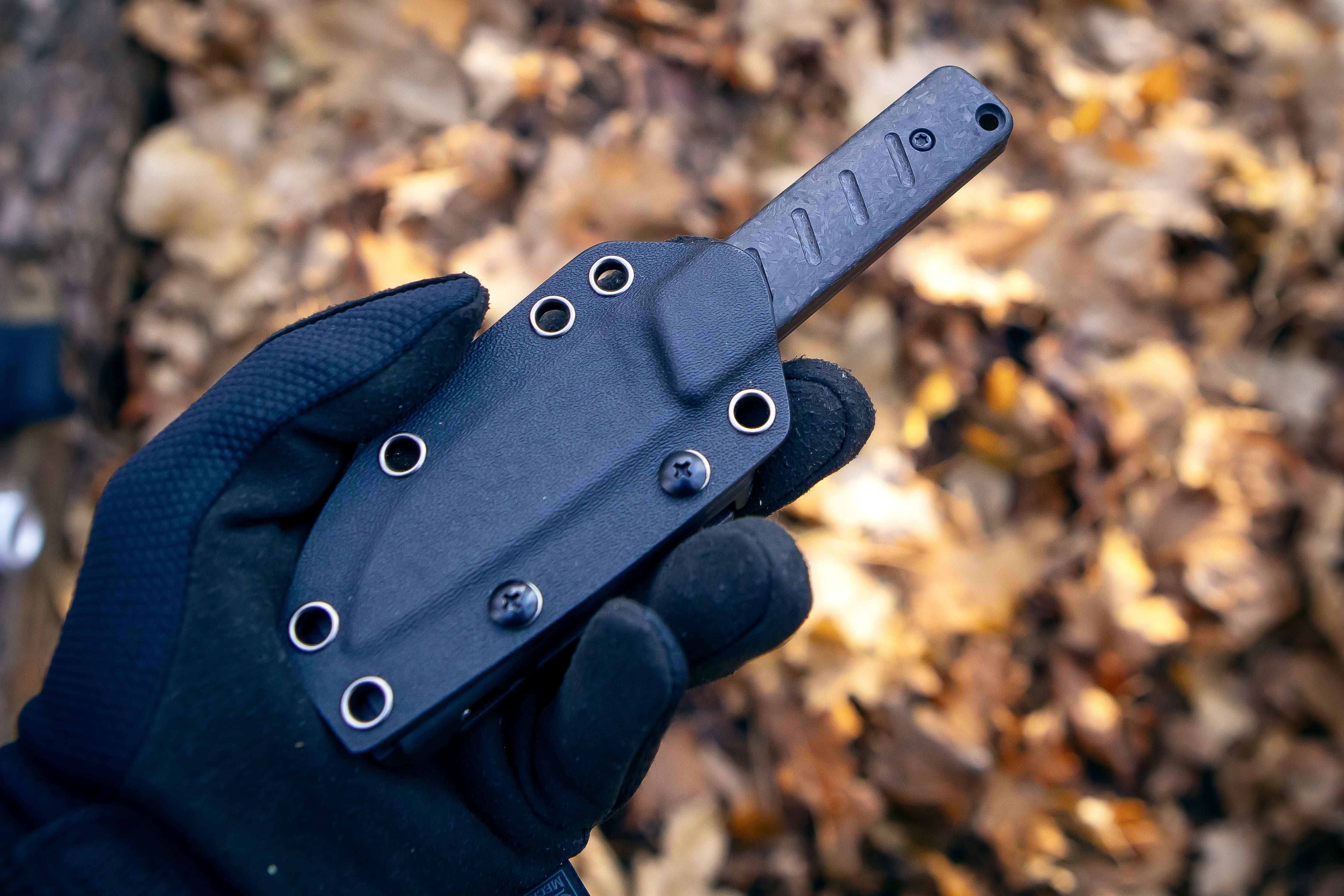Bainha de kydex preta com sistema Tek-Lok também merece menção, você pode carregar a faca na posição vertical ou horizontal, pode prendê-la ao cinto ou a outra parte do seu equipamento. Não há nada a criticar no acabamento, a bainha é resistente e a faca fica realmente segura nela, o fabricante também se preocupou com isso.