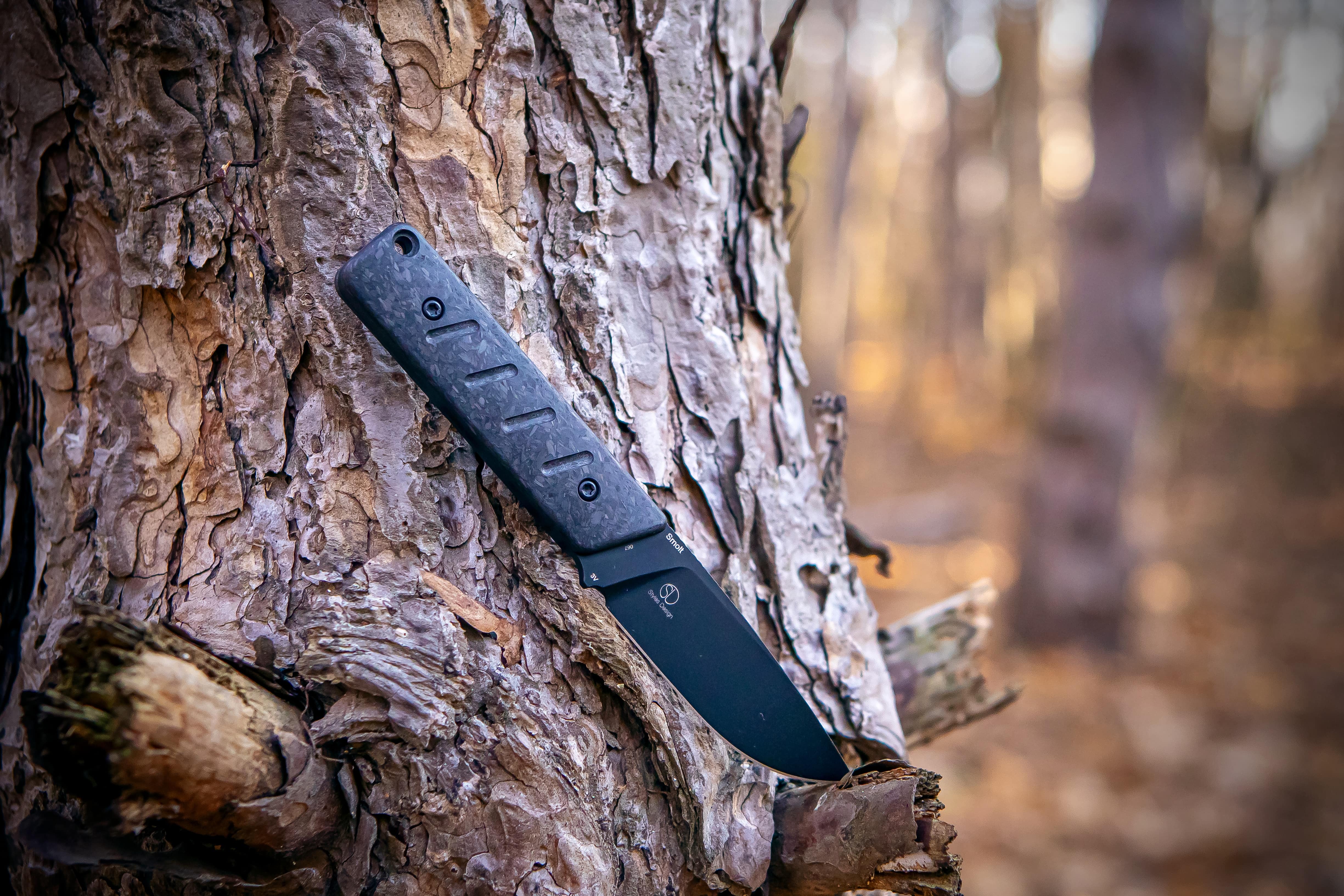 feita de fibra de carbono (Marbled Carbon Fiber) com um lindo padrão marmorizado é leve, mas ao mesmo tempo resistente e oferece uma pegada segura e confortável. O elegante padrão marmorizado não é apenas visualmente deslumbrante, mas também prático e esconde bem os sinais de desgaste. Enquanto isso, a lâmina com acabamento Black PVD parece moderna e tática.